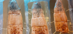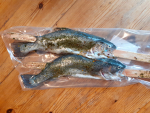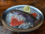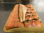 Seeforelle filetiert und geräuchert, in 3 Stücke geschnitten, 1 Stück Natur, 1 Stück mit Chilli, 1 Stück mit Pfeffer,