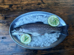 Fischplatte: gebeizte Lachsforelle mit Dill, kaltgeräucherte Lachsforelle und Saiblingfilet geräuchert.