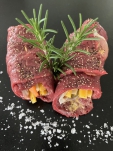 Saltimbocca vom Rehschlögel gefüllt mit Rohschinken & Frischkäse, an frischem Salbei & Rosmarin aus unserem hauseigenen Kräutergarten!